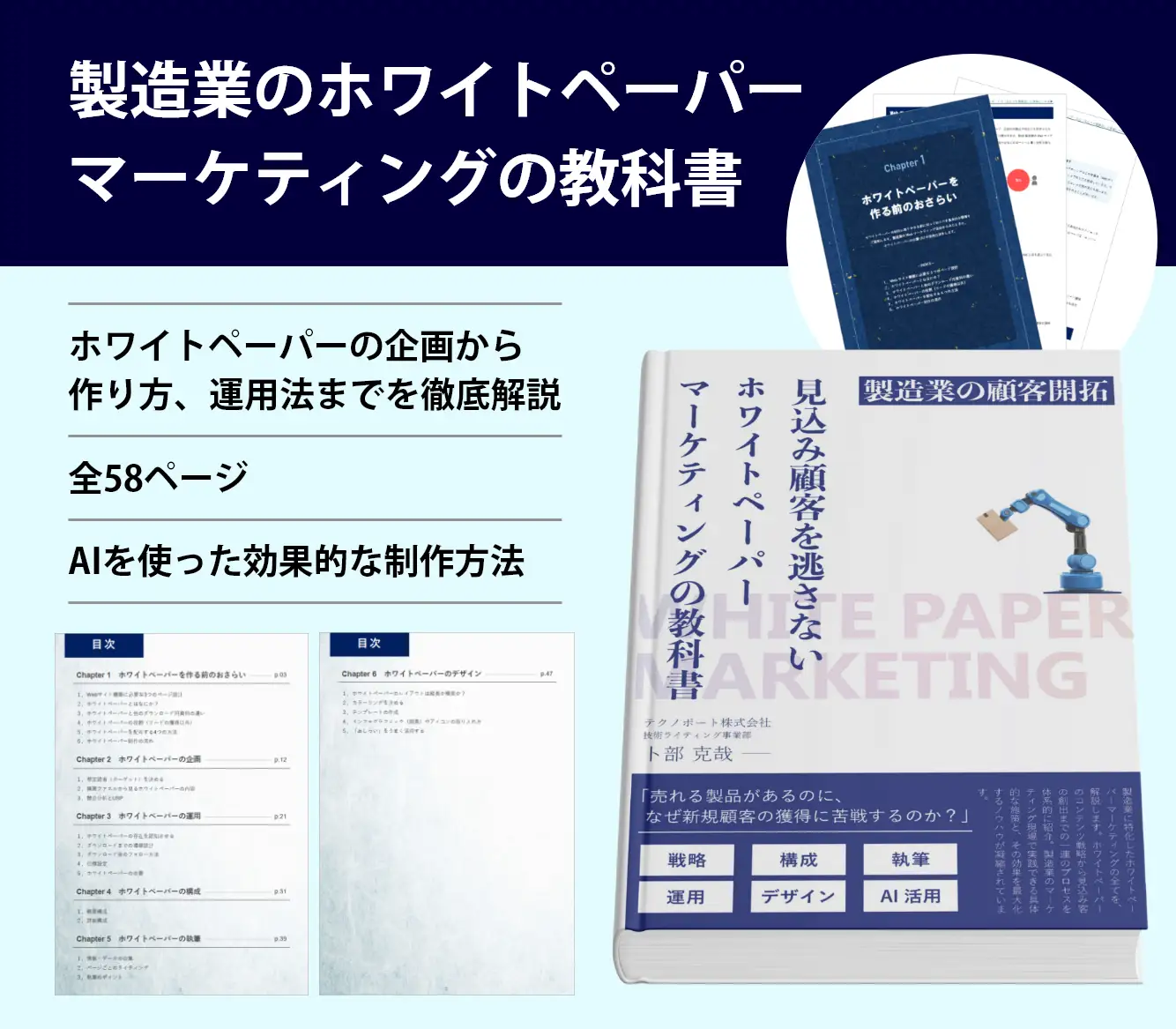 また、ホワイトペーパーの制作方法について網羅的に解説した「ホワイトペーパーマーケティングの教科書(全58ページ)」を発行しました。無料でダウンロードいただけますので、どうぞご覧ください。