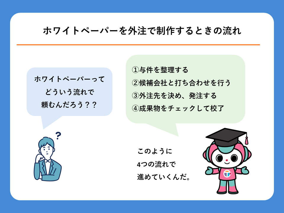 ホワイトペーパーを外注する流れは次の通りです。それぞれのステップで確認すべき点を次の章から紹介します。