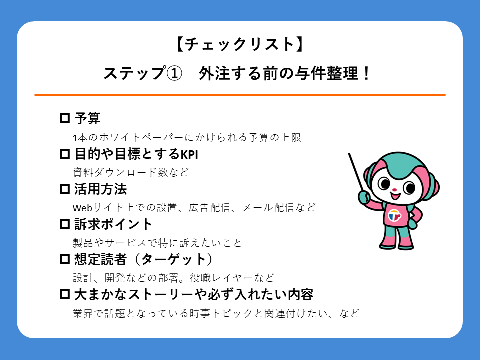 ホワイトペーパーを外注することになったら、実際の制作会社と打ち合わせを行う前に次の情報を整理しておく必要があります。これらを決めておくことで打ち合わせや制作をスムーズに進めることができます。