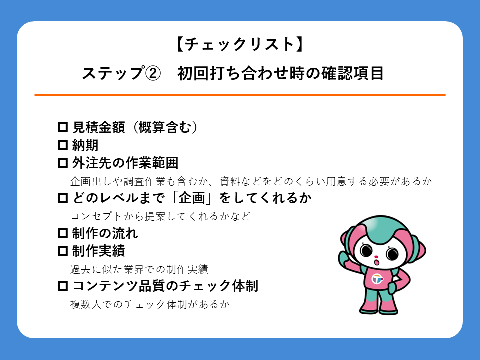 見積、納期、作業範囲、企画レベル、制作フロー、実績、品質チェック体制を確認します。 - 理想的な依頼方法