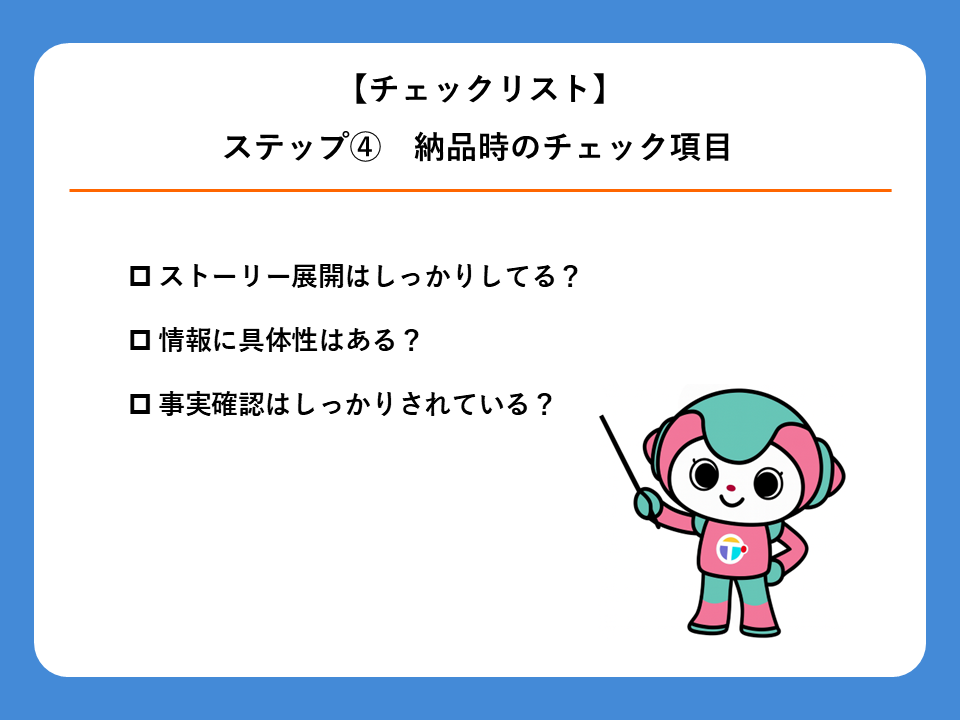 発注後に外注先から成果物が納品された際には、社内でのチェックも重要な工程になります。初稿のチェック項目を次に整理しましたので、ご参考にしてみてください。