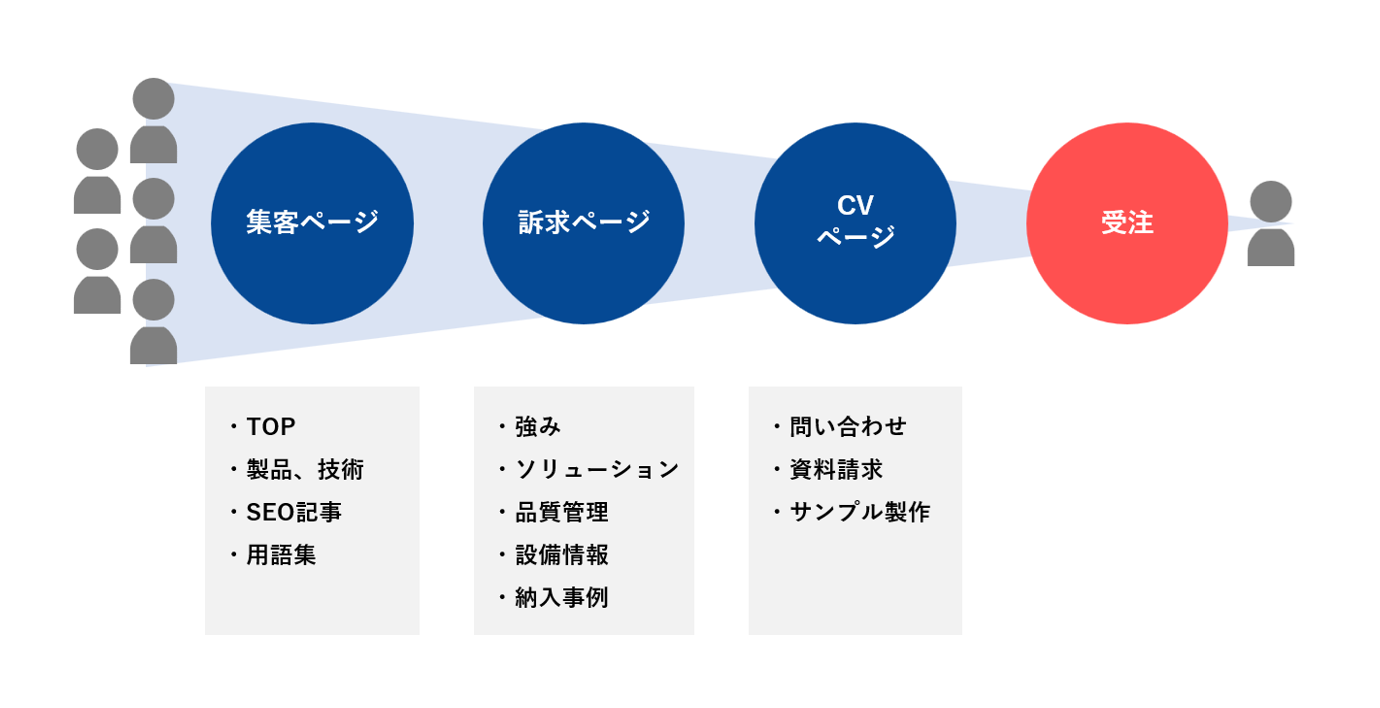 Webサイトの各ページには、役割があります。大きく分けると、①集客のためのページ、②自社の製品や技術力を訴求するためのページ、③顧客情報を獲得するためのページ(コンバージョンページ)の3つに分類できます。BtoB製造業のWebマーケティングでは、各ページが専門性と信頼性を担保しながら、潜在顧客を段階的に問い合わせなどのゴールへと導く役割を果たします。