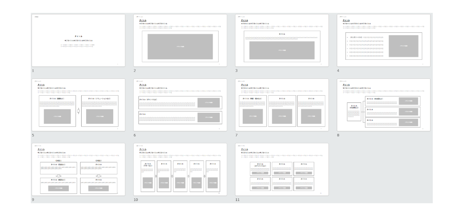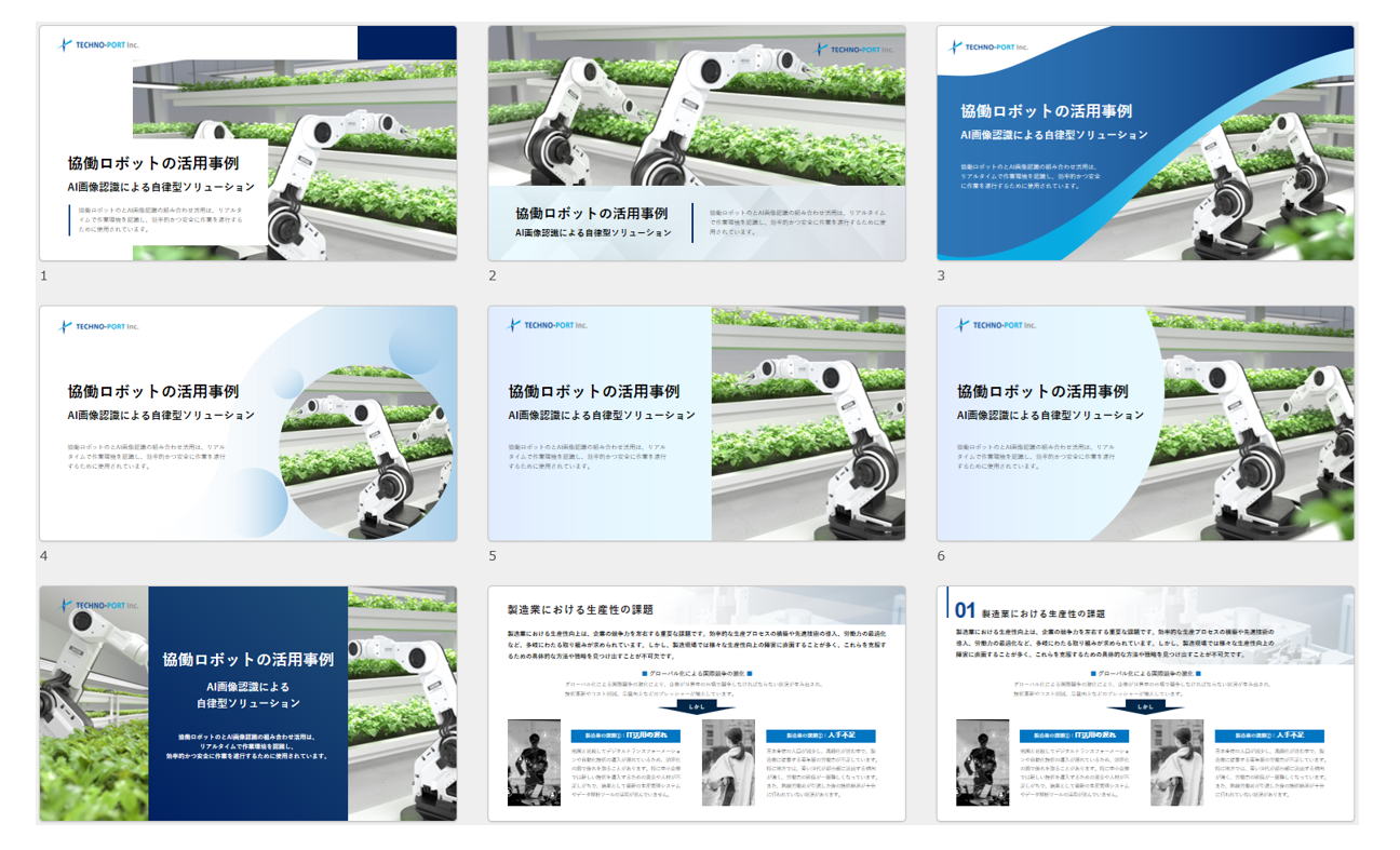 参考までに、海外向けの資料ではページごとに異なるテンプレートを使う傾向があります。一方、日本向けの資料では全ページを通して統一したテンプレートを使用するケースが多いようです。もし海外向けのマーケティングで使用される場合は、ページごとのテンプレートを変える方法も検討してみてください。
