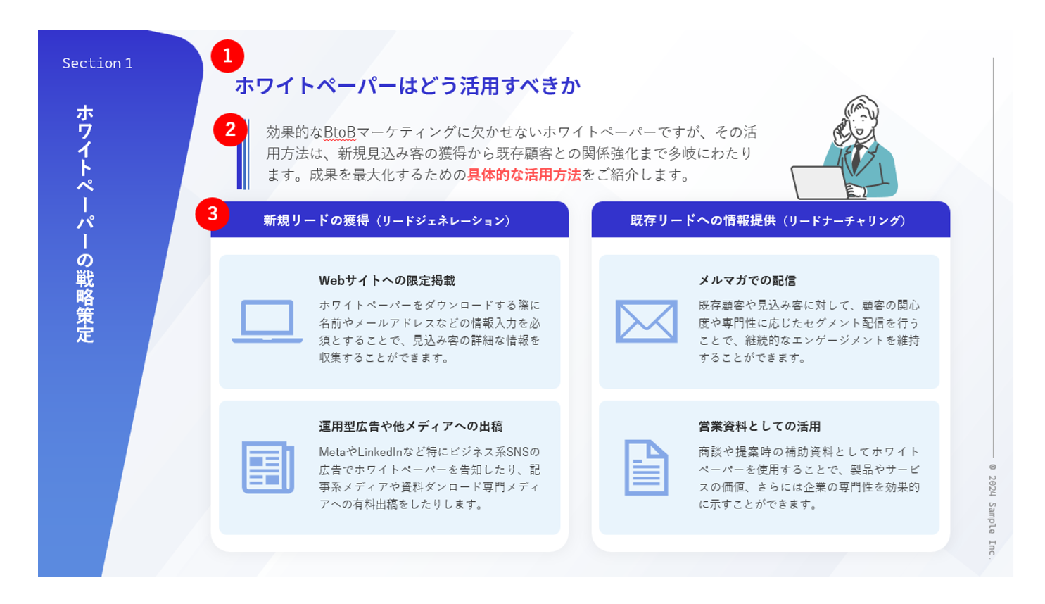 この資料は、まだ製品やサービスについて深い知識を持っていない新規顧客をターゲットにしており、読者が次のステップに進むための足掛かりとなる役割を果たします。