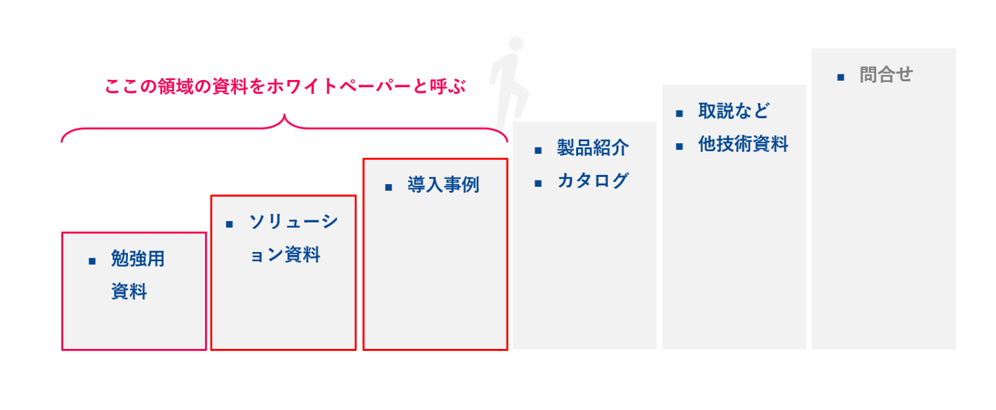 製造業のダウンロード資料において、STEP1~3の資料を総称してホワイトペーパーと呼びます。つまり製品カタログやサービス資料の前段の興味層に向けた資料のことをホワイトペーパーと定義します。