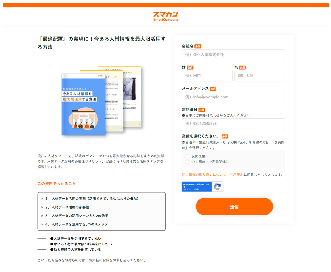 顧客情報を取得するためのページでは、リード(顧客の会社名・氏名・連絡情報など)獲得につながる具体的なアクションを促します。製造業特有の商談プロセスを意識し、以下のような形で見込み顧客の情報を獲得します。このページは「コンバージョンページ」と呼びます。